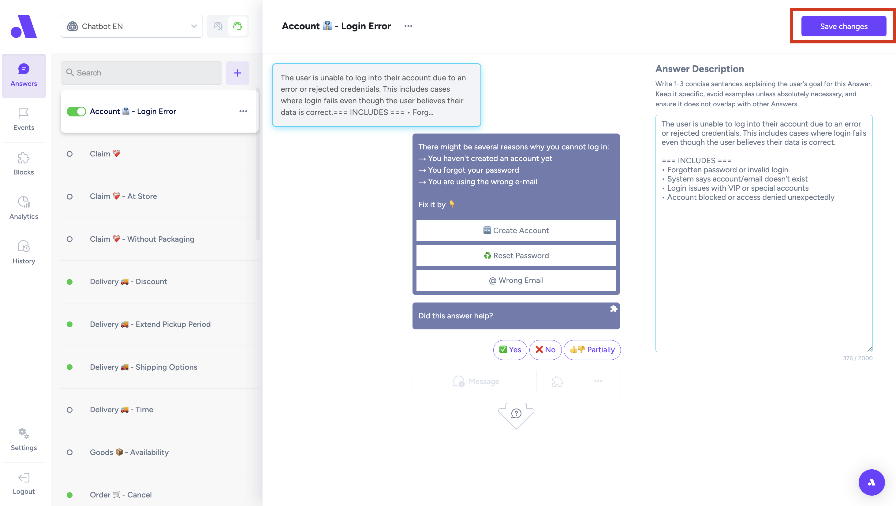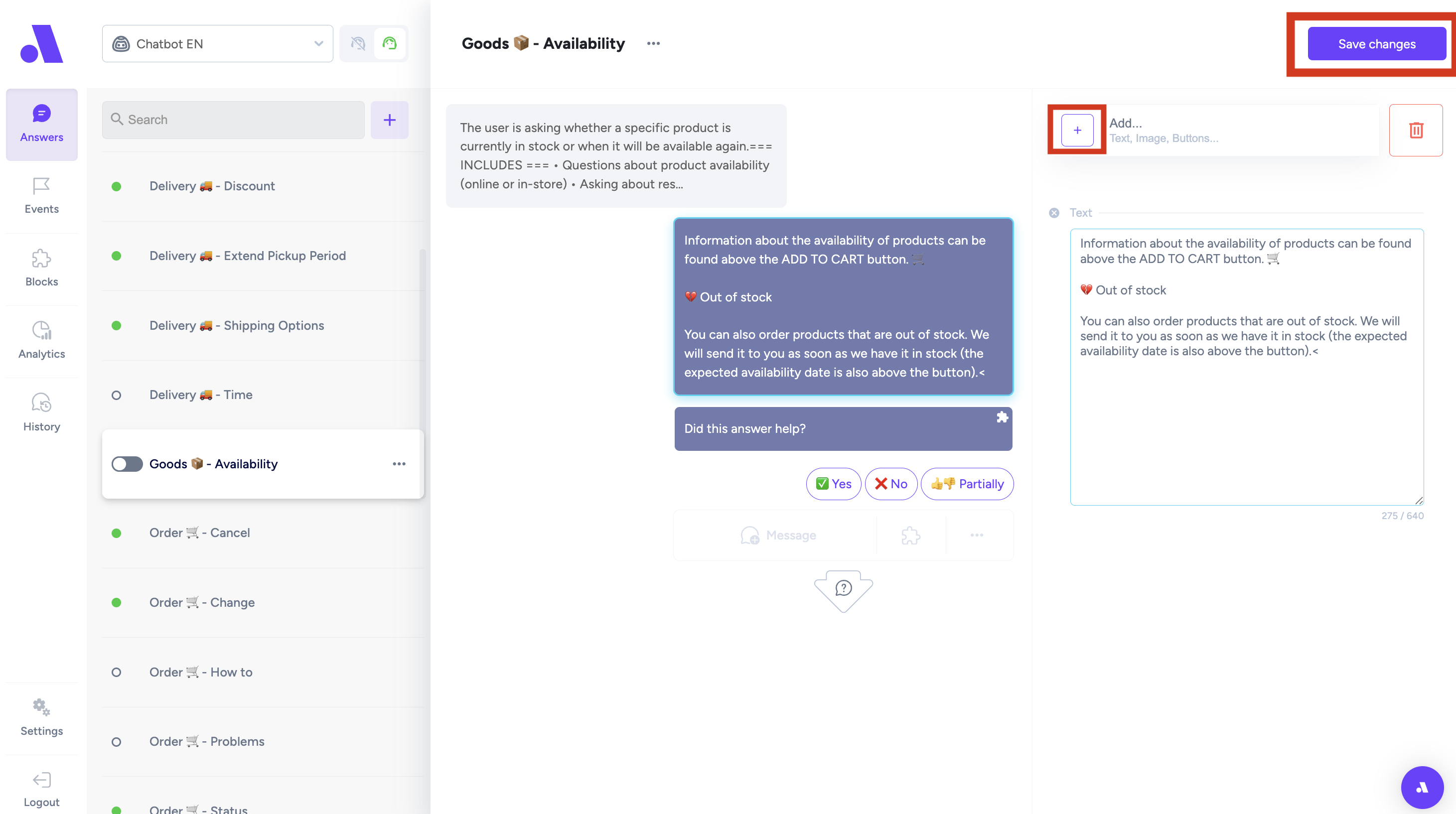 •On the left side you can see the grey message bubble which is an "Answer description" (descripiton of how the customers would ask about a specific topic: delivery, order status,..)