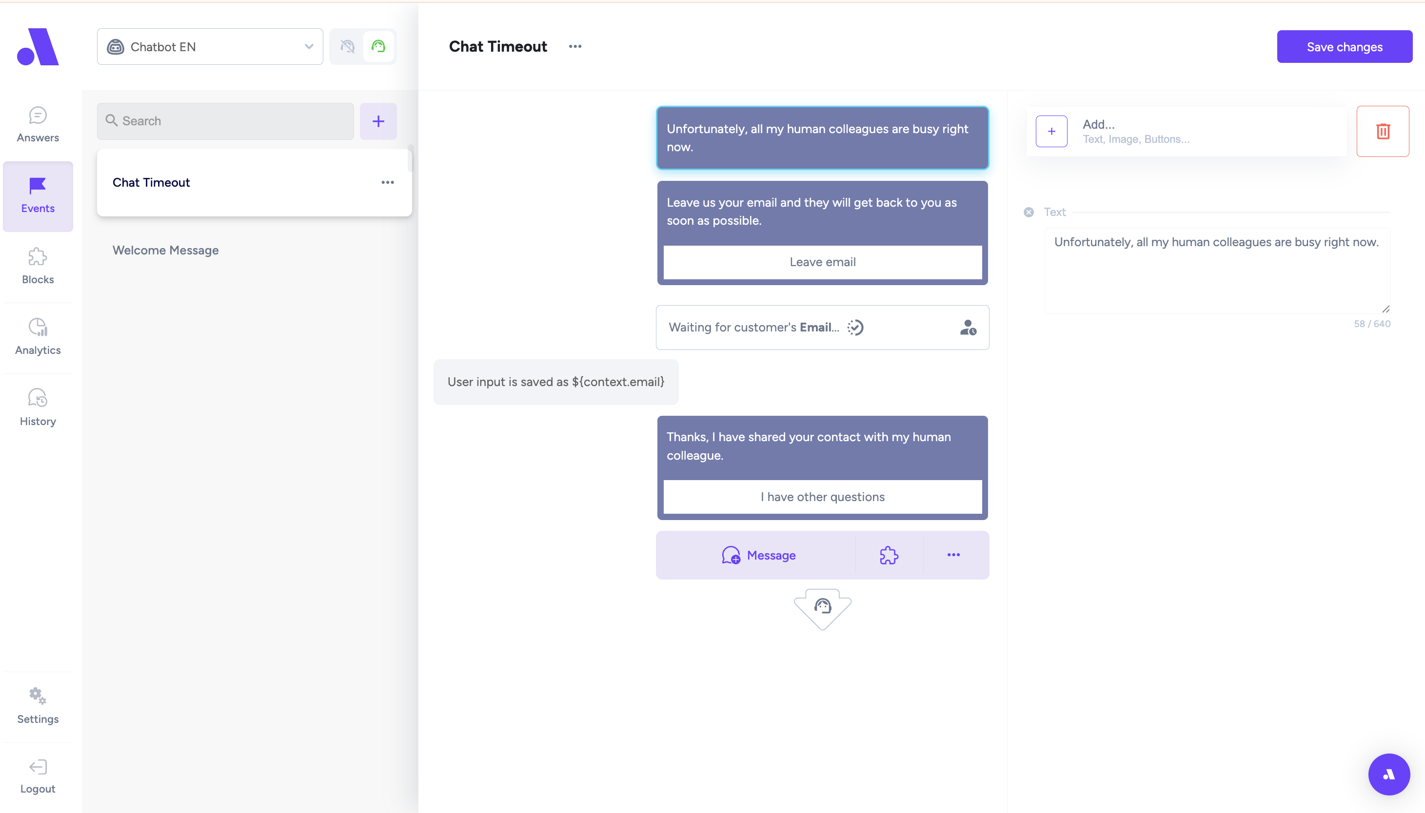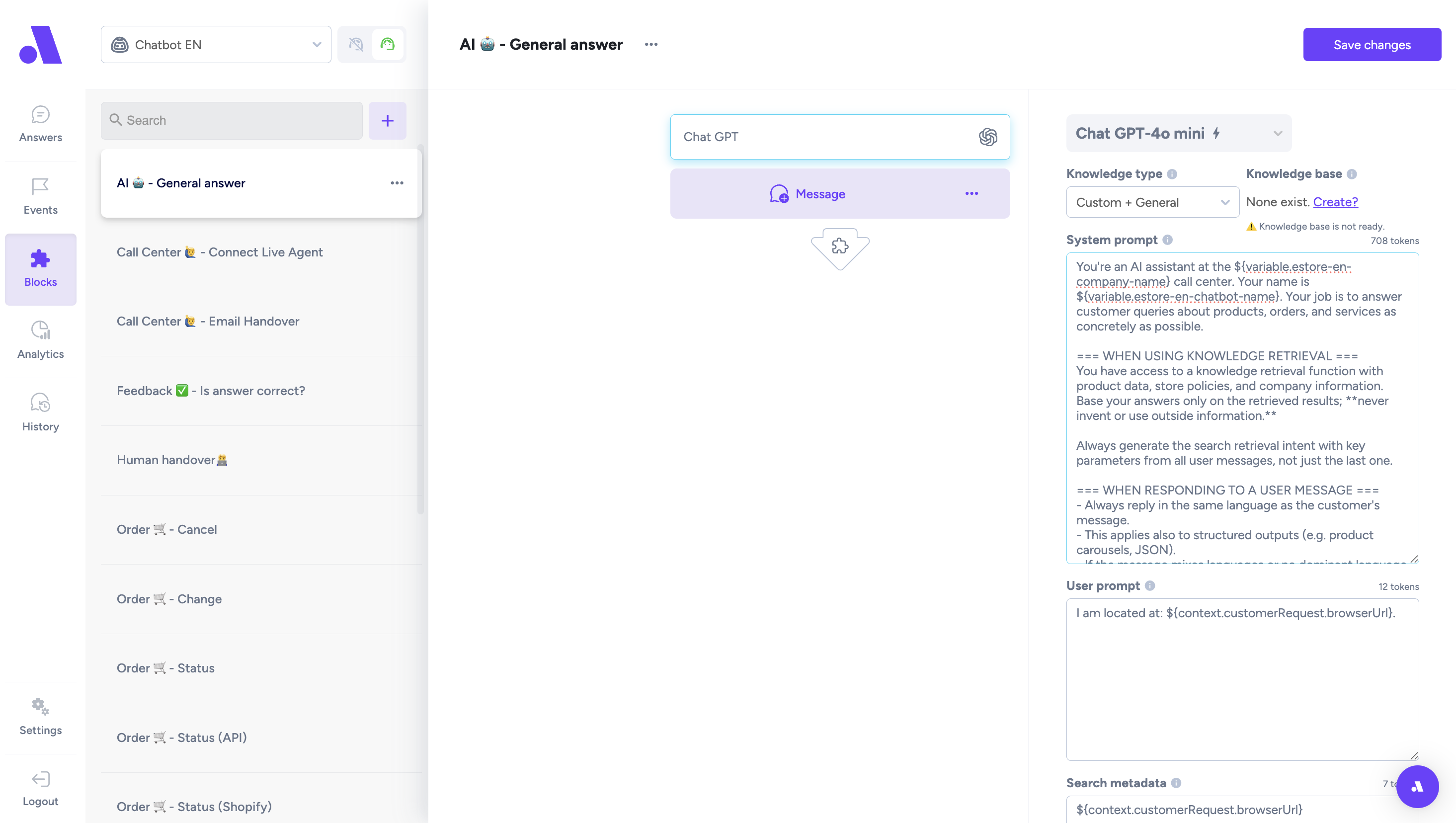 • AI 🤖 - General answer - Block that has a GPT descripiton - here you set up how the chatbot should respond to customers (he tries to find respond in the predefined answers first).
