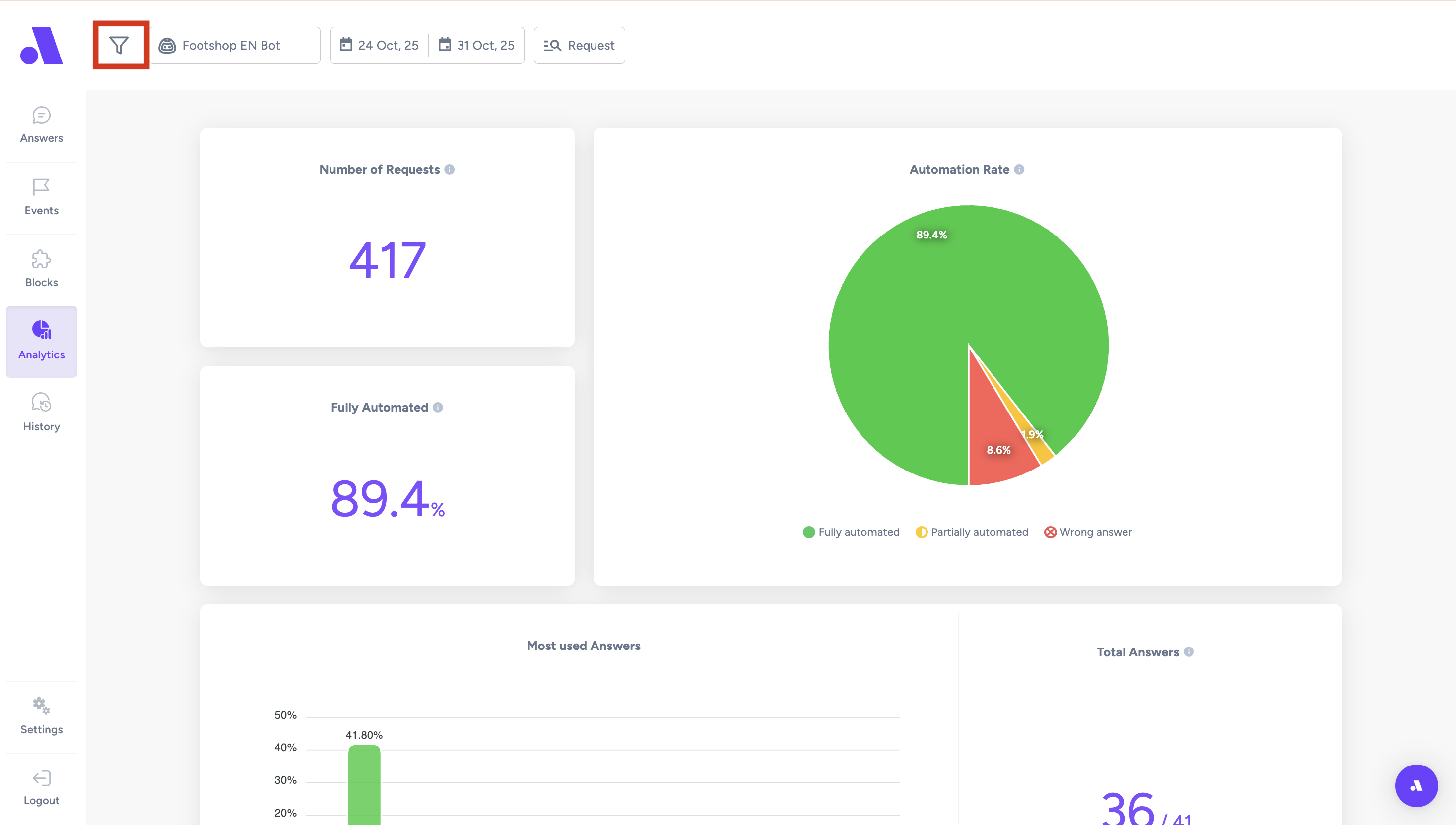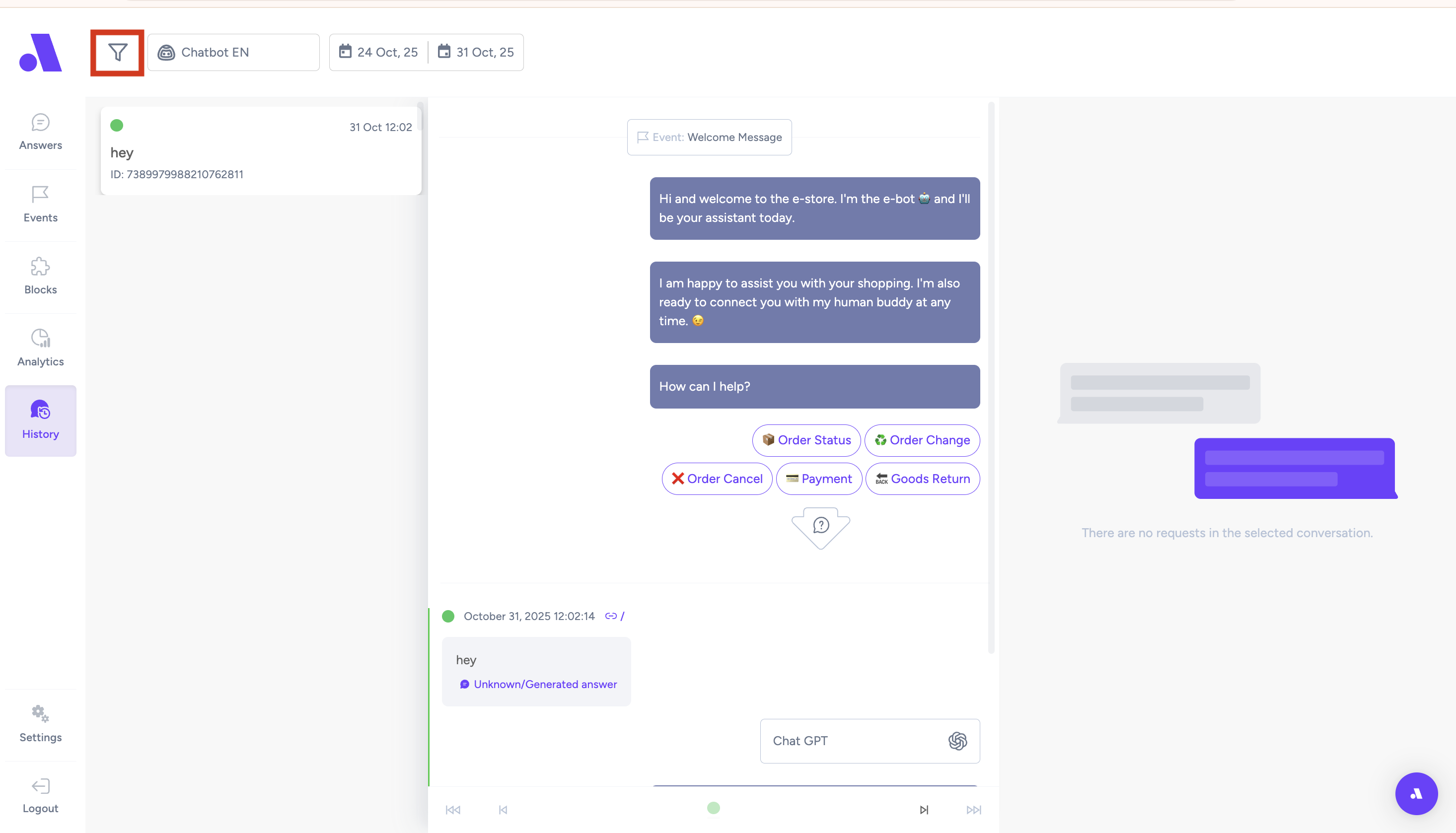 •You can use a filter - date, which chatbot, request outcome