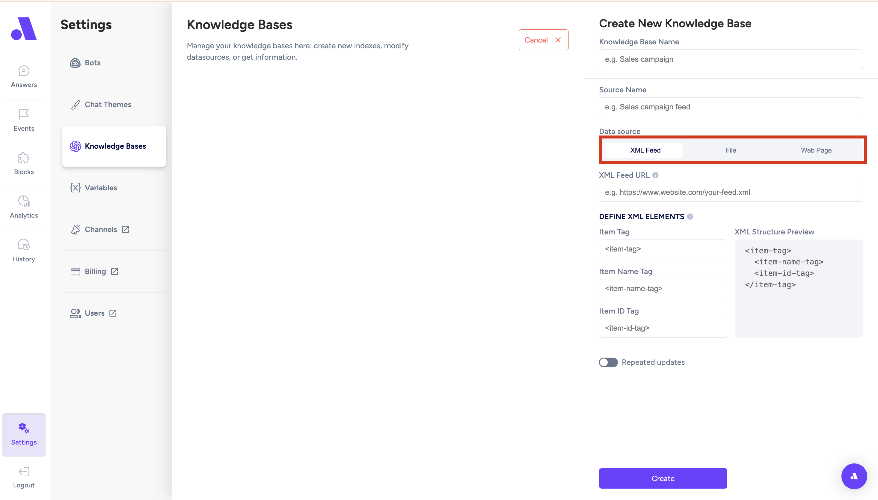 •Knowledge Base - you can uplaod the knowledge you would like the chatbot to have: XML feed, Static files from your website, Web page scraping