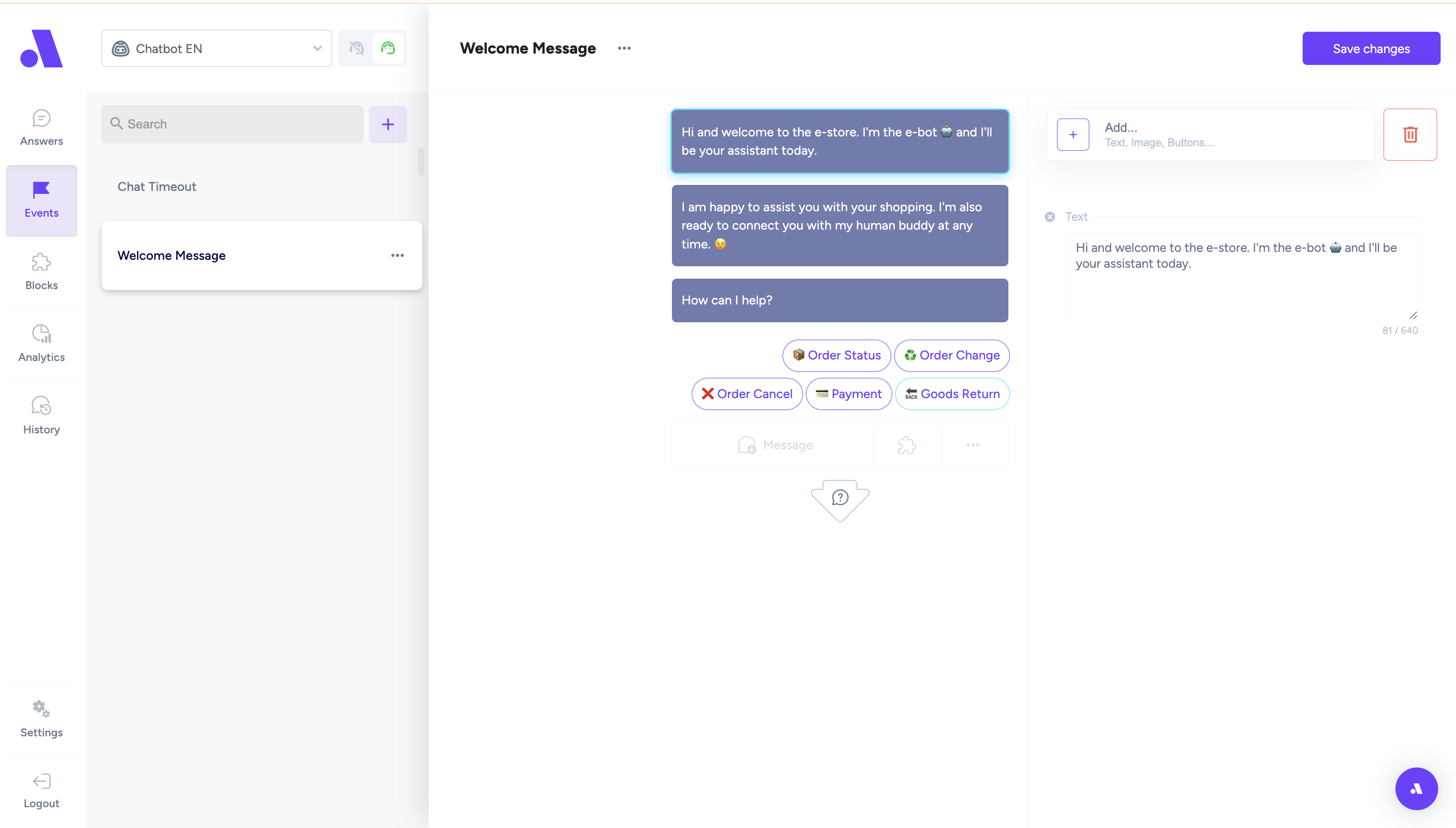 •On the right side you can see the purple message bubble which is the "Answear" (predefined answer of how the chatbot will answer to a customer about a specific topic: delivery, order status,..)