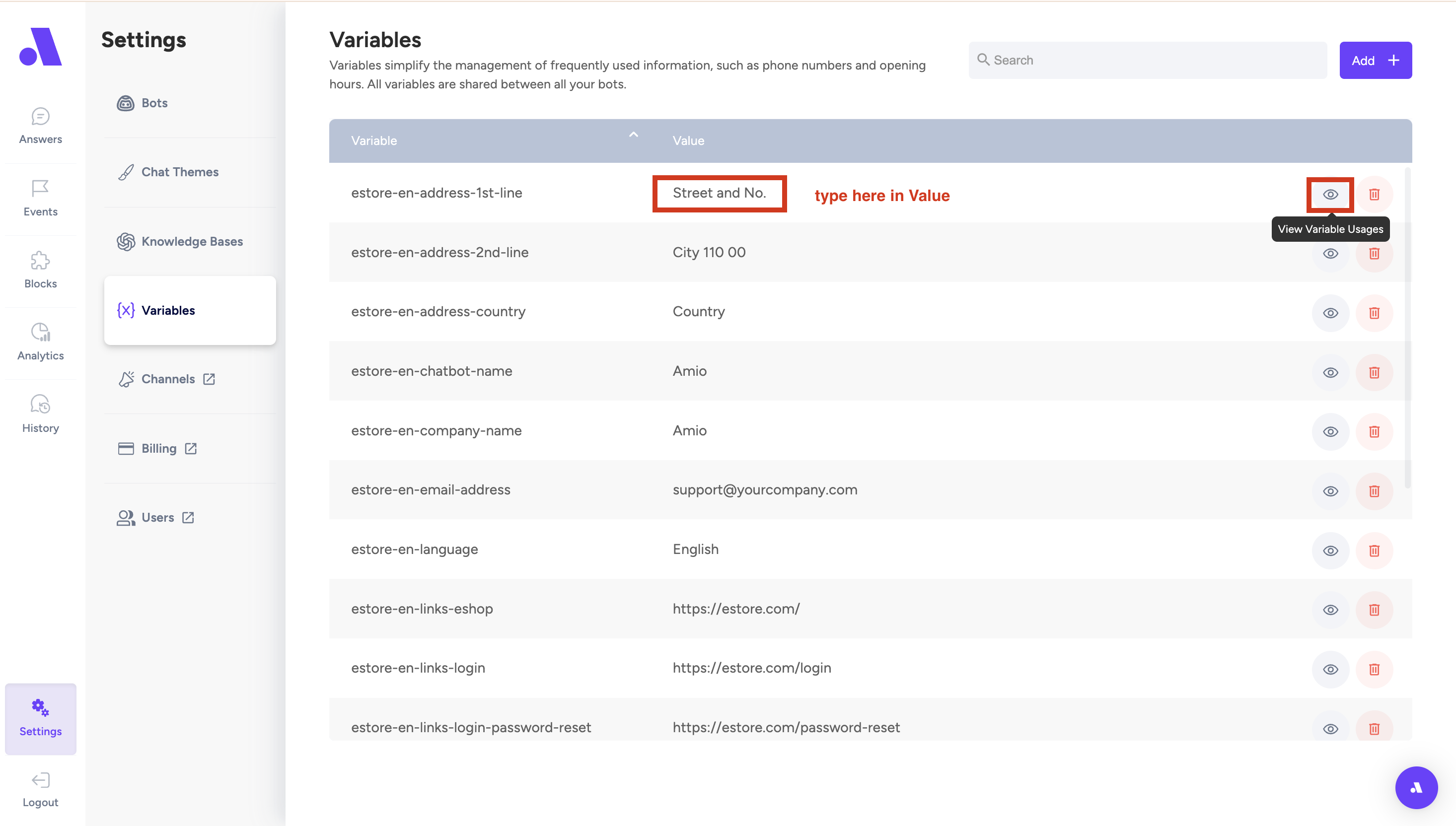 •Variables - Information about your company you fill in, so chatbot can use them in conversations