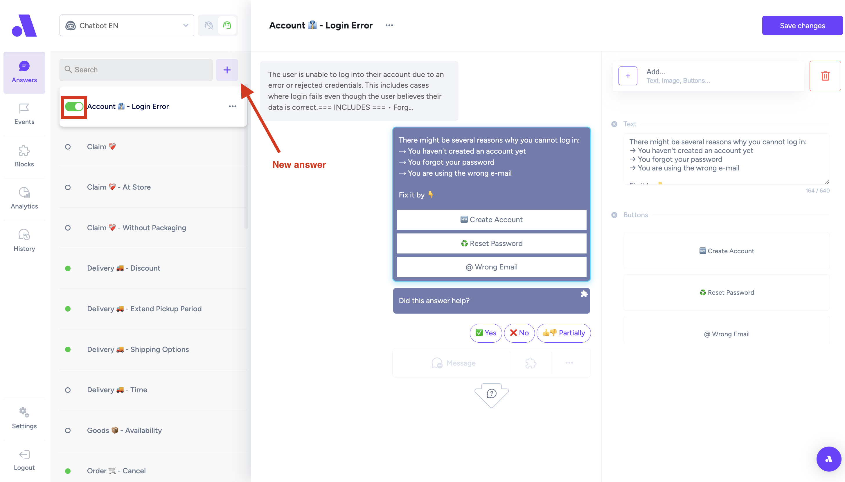After creating a new chatbot, go to "Answer" section