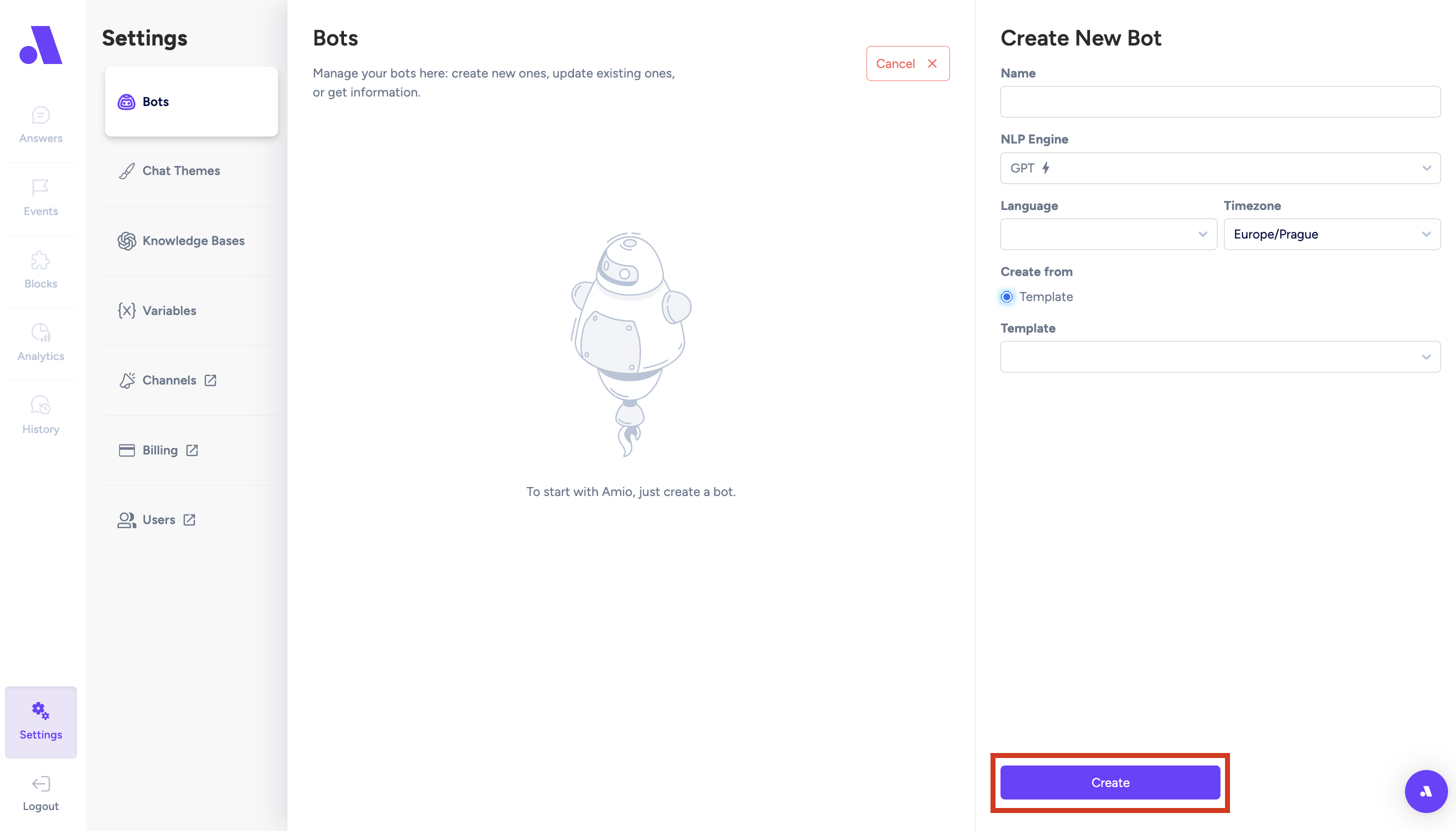 - Create a new chatbot by giving a Name, choose the GPT NLP Engine (easier to set up), Language, Timezone, Create from Template -> E-store (EN)